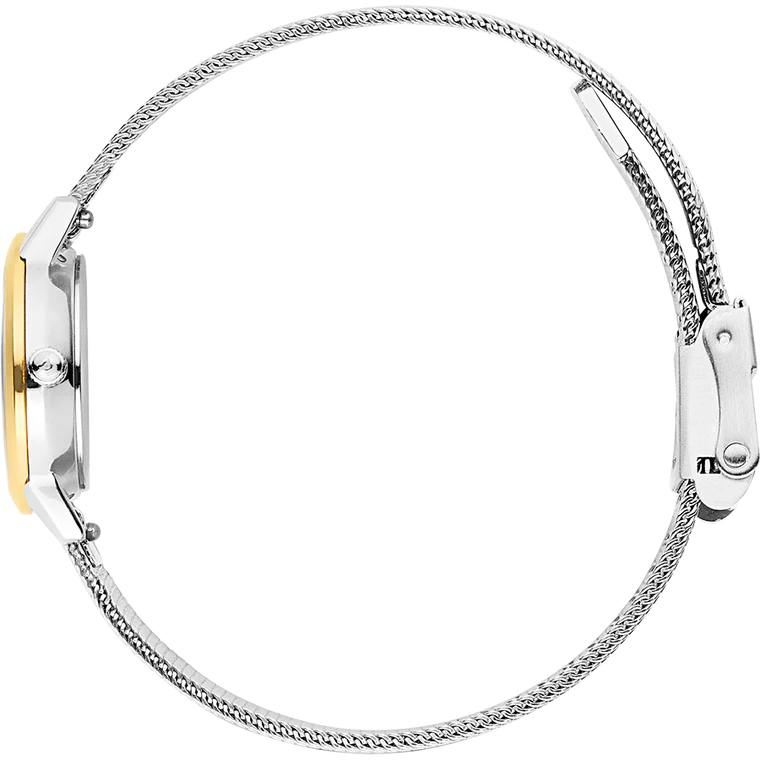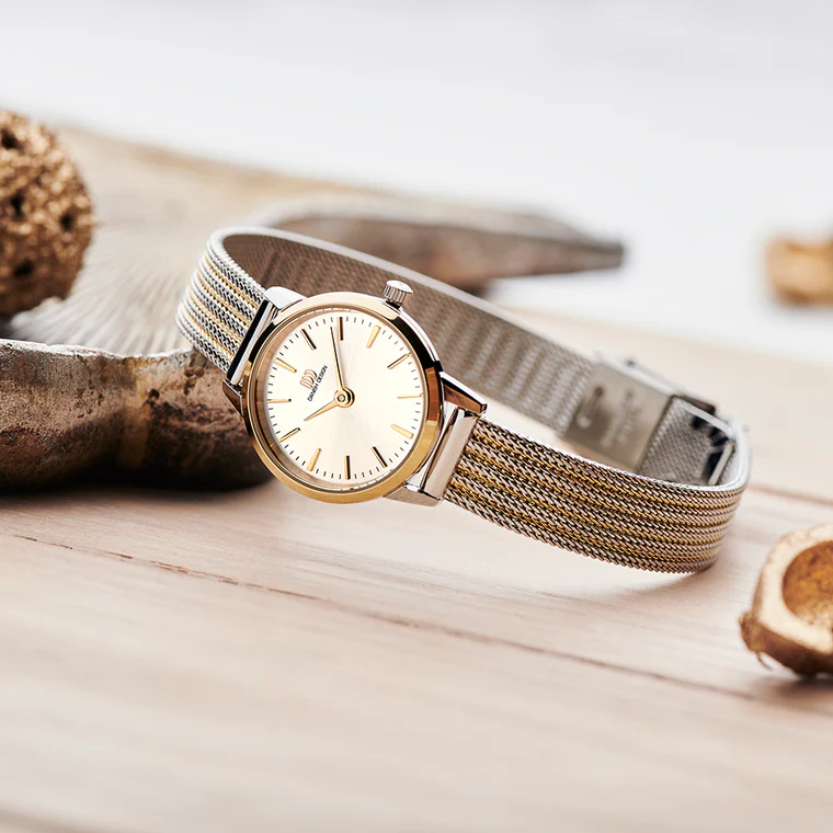 Dit dameshorloge heeft een verfijnde, kleine kast van 22 mm en een tweekleurige gouden mesh band die elegant om je pols valt. De zilverkleurige wijzerplaat met gestreepte indexen geeft het horloge een subtiele, moderne look, terwijl het mineraalglas zorgt voor goede bescherming. Het uurwerk is een betrouwbare quartz beweging en het horloge is spat- en regenbestendig tot 3 ATM. Door het minimalistische Scandinavische design past dit elegante horloge bij zowel dagelijkse outfits als speciale gelegenheden.